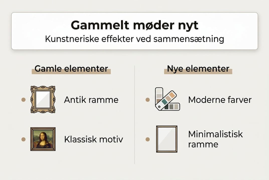 Forestil dig en stue, hvor et mørkt oliemaleri fra det 19. århundrede hænger i en slank, hvid moderne ramme. Det burde måske virke forkert. Men i stedet skaber det præcis den spænding, der gør rummet uforglemmeligt. Mange tror, at gammelt og nyt er modsætninger, der ikke hører sammen. Virkeligheden er den modsatte: Når fortidens materialer og nutidens udtryk mødes, opstår noget, der hverken er rent nostalgisk eller koldt moderne. Du får dybde, karakter og en atmosfære, som ingen møbelkatalog kan kopiere. Denne artikel guider dig trin for trin gennem, hvad kombinationen egentlig betyder, hvilke fordele den giver, og hvordan du undgår de klassiske faldgruber.